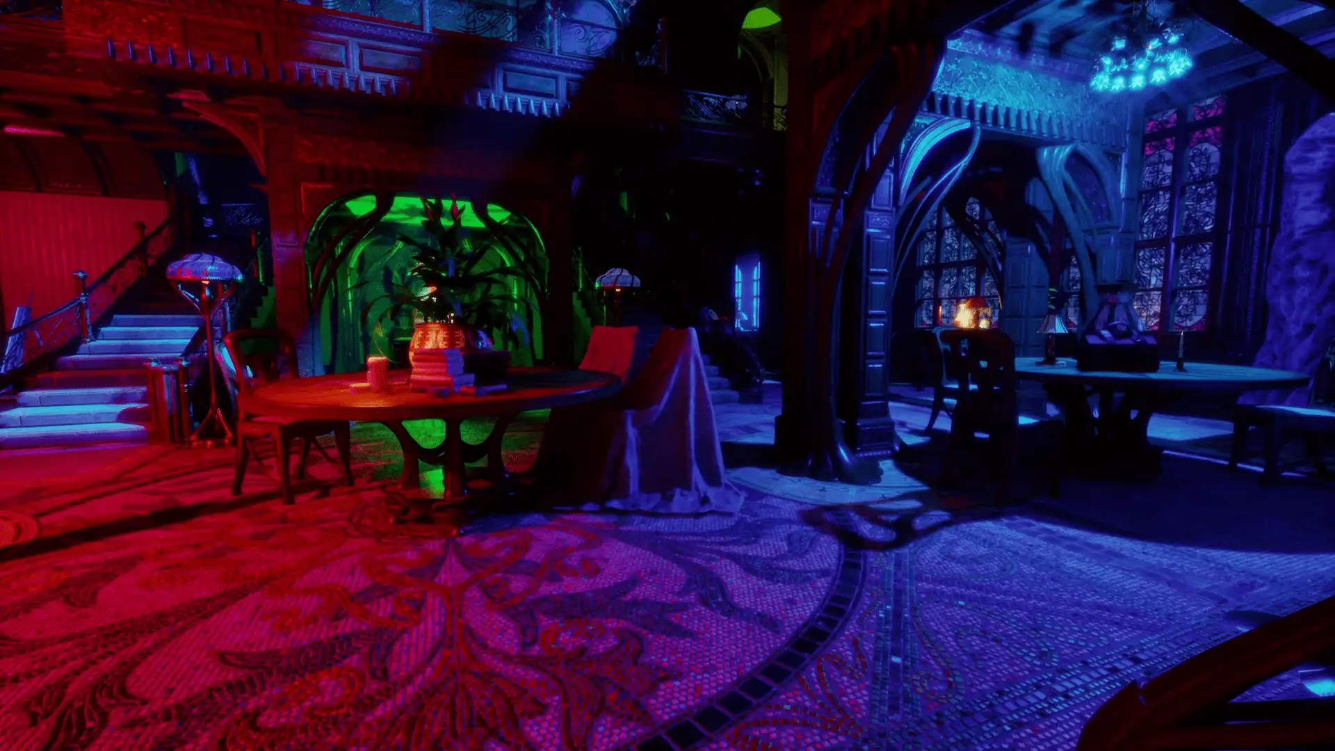 One of Dead Format's standout features is its use of live-action footage. Before entering each film world, players can watch a short live-action sequence on an in-game television, with each film drawing inspiration from a different horror era, ranging from German Expressionist horror to practical-effects splatter and colorful 1980s slashers. Each world is visually filtered to reflect its cinematic influence, reinforcing the game's analog horror aesthetic.