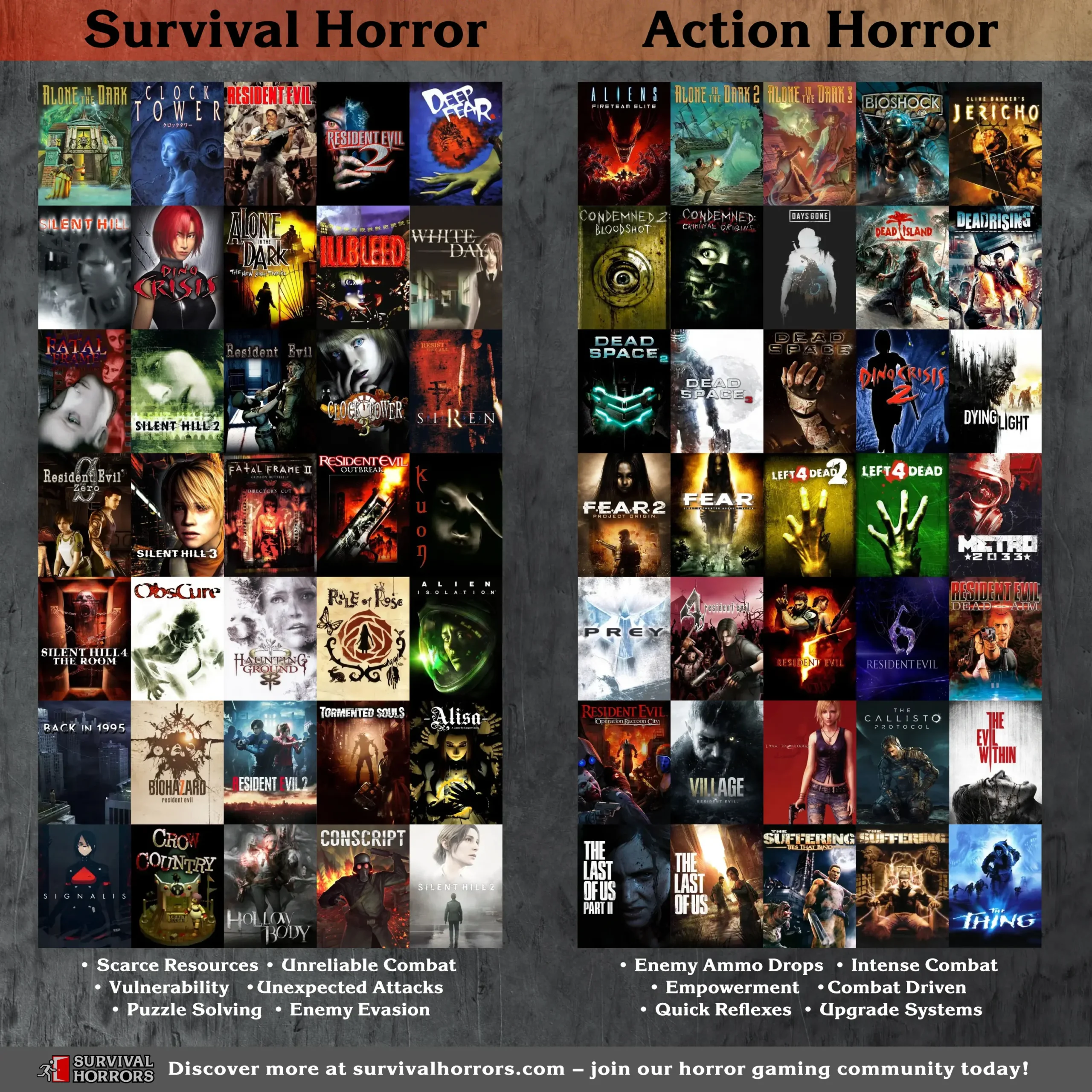Over the past year and a half, I’ve been cataloguing every survival horror game I can find, with the goal of creating the most comprehensive list of survival horror titles to date. During my research, I kept encountering a familiar image titled Survival Horror vs. Action Horror. While I agree with many of the selections in that now-iconic comparison, I decided it was time to create a modernised version of the image, updated to reflect more recent releases.